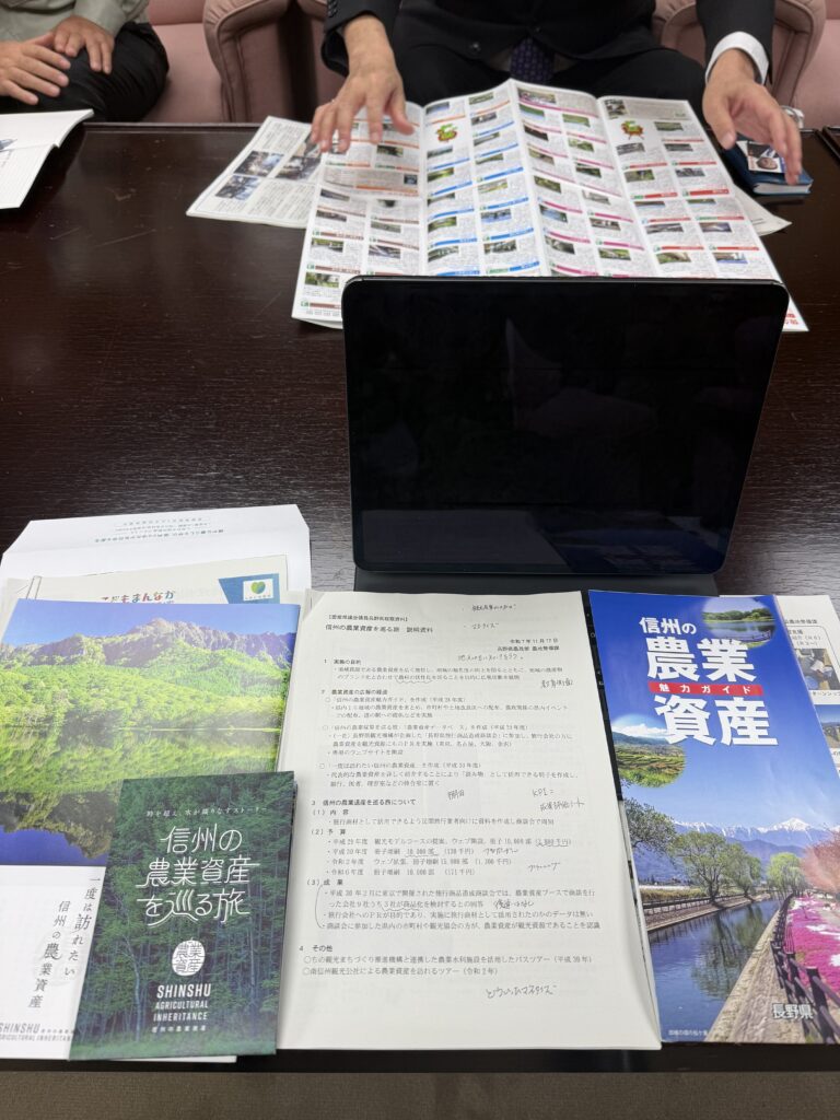 さらに「信州の農業資産を巡る旅」の取組についても学びました。長野県では圧巻の棚田、ため池群、歴史ある水路橋など、多様な農業資源を地域の文化や観光資源として再評価し、体験型のモデルコースとして体系化しています。これらは単なる観光ではなく、地域住民や来訪者に農業の価値や技術、歴史を伝え、農村の活力創出につながる重要な資産として発信されています。