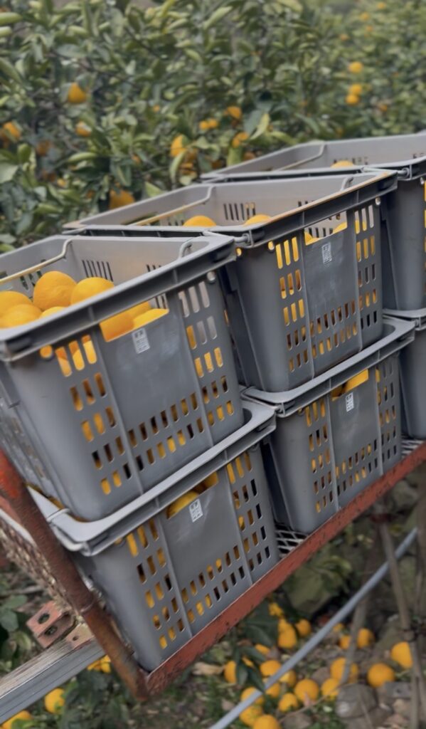 宇和島市下波地区を訪問し、柑橘農家からの相談対応およびふるさと納税産品づくりの支援を行った。当日は急傾斜地に広がる園地において、ポンカンおよび河内晩柑の収穫作業を視察・体験し、足場の不安定さや運搬の困難さなど、現場の厳しい労働環境を実感した。