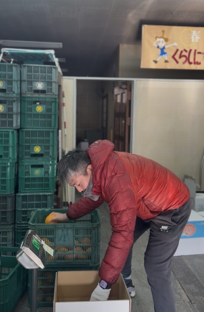 宇和島市下波地区を訪問し、柑橘農家からの相談対応およびふるさと納税産品づくりの支援を行った。当日は急傾斜地に広がる園地において、ポンカンおよび河内晩柑の収穫作業を視察・体験し、足場の不安定さや運搬の困難さなど、現場の厳しい労働環境を実感した。